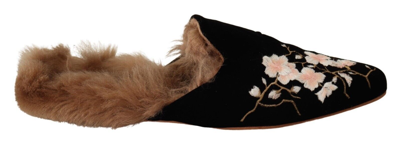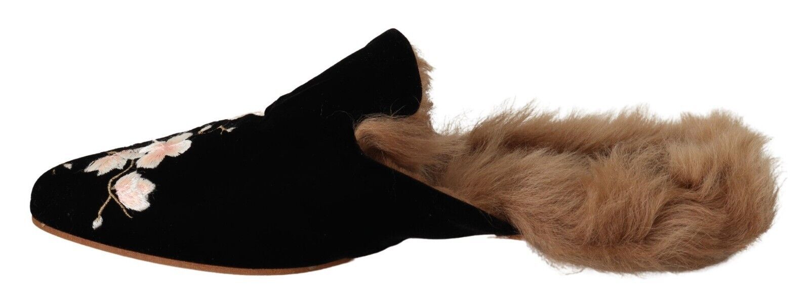 GIA COUTURE Black Velvet Floral Fur Slip On Flats Shoes