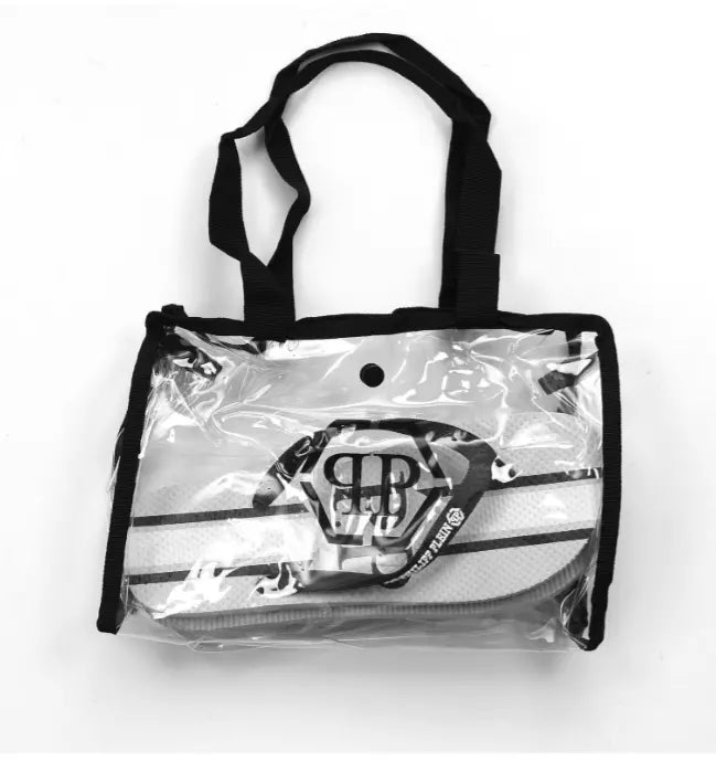 Philipp Plein women’s flip flops in polyester with grey and white rubber sole with logo print, black upper