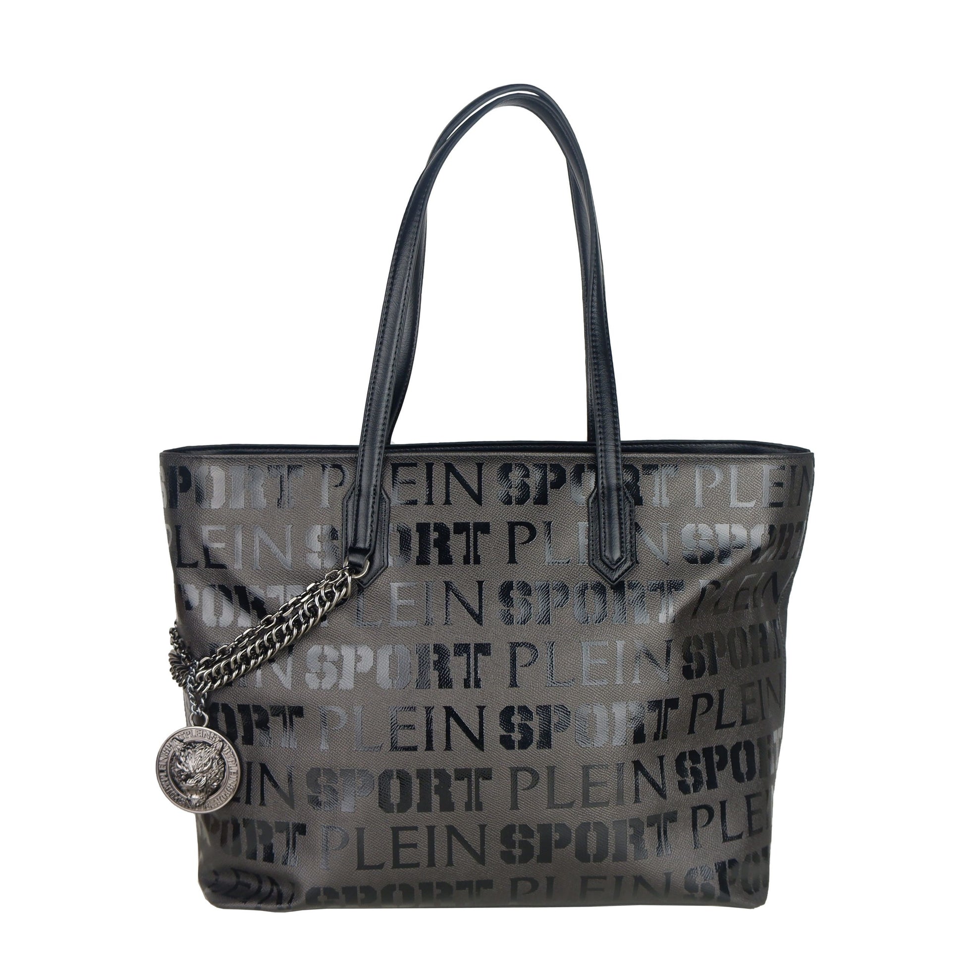 Plein Sport shopping bag, black color, brand logo design all over, crossbelt included. Size cms: 50x32x16