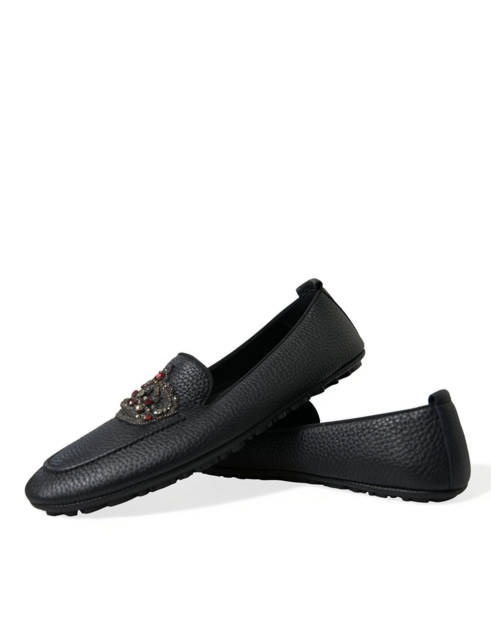 Dolce & Gabbana Black Leather Crystal Embellished Loafers Dress Shoes