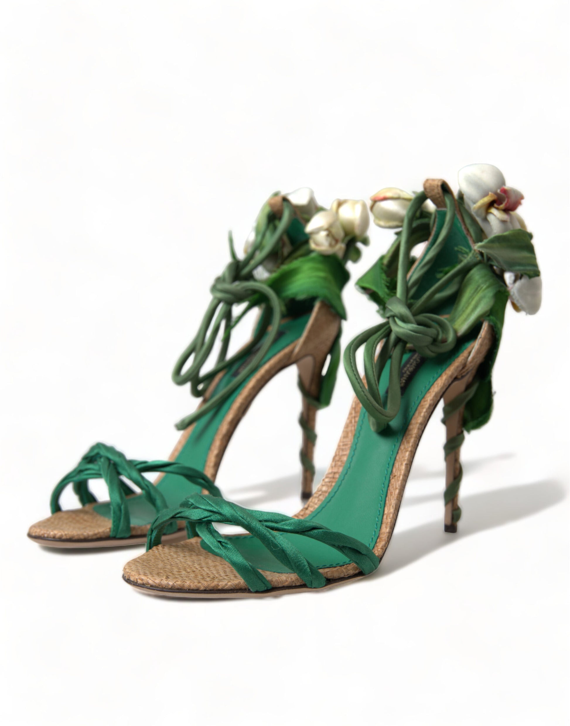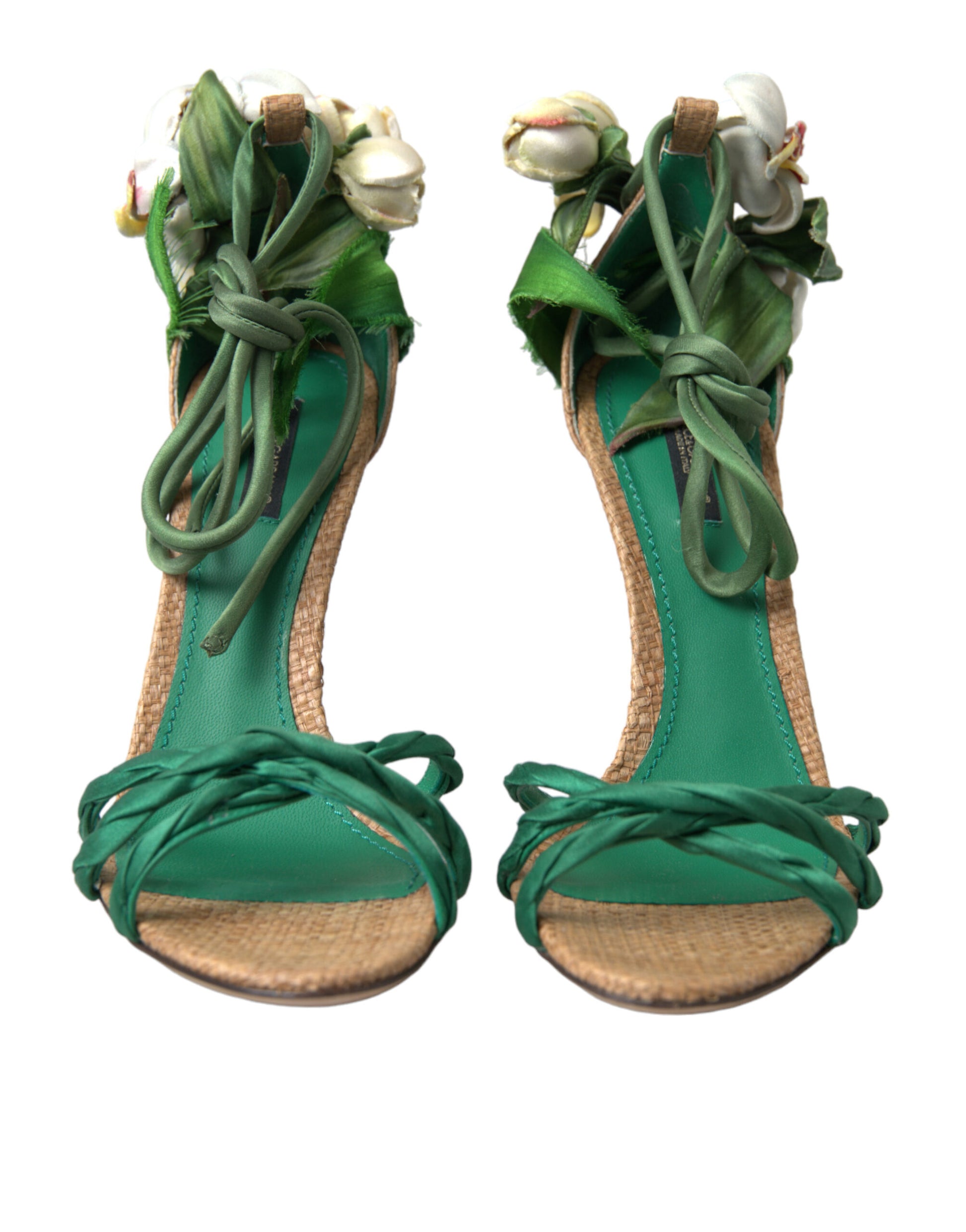 Dolce & Gabbana Green Flower Satin Heels Sandals Shoes