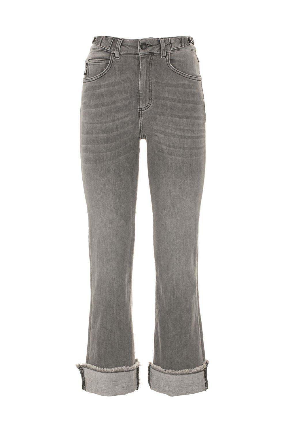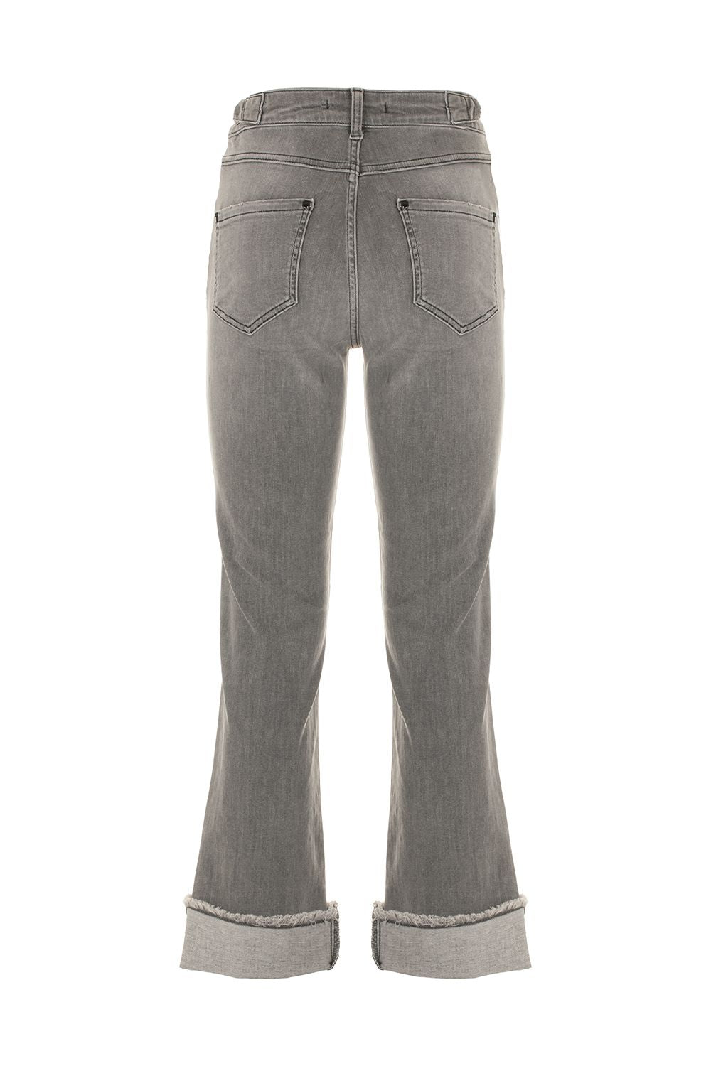 Imperfect denim, light blue color, buttons and zip closure, 5-pocket design, slightly elasticized