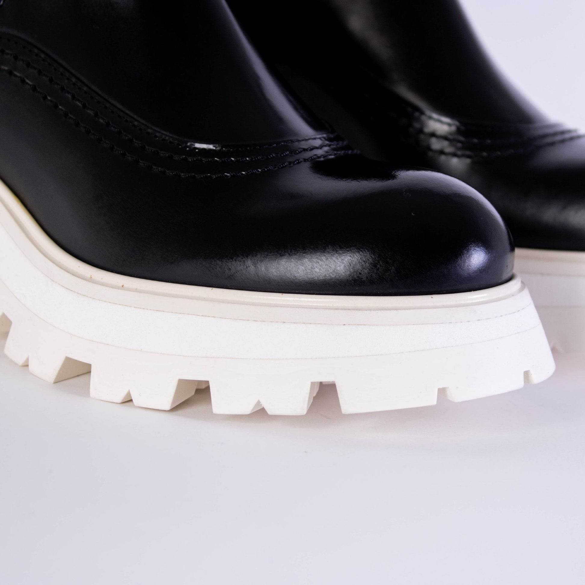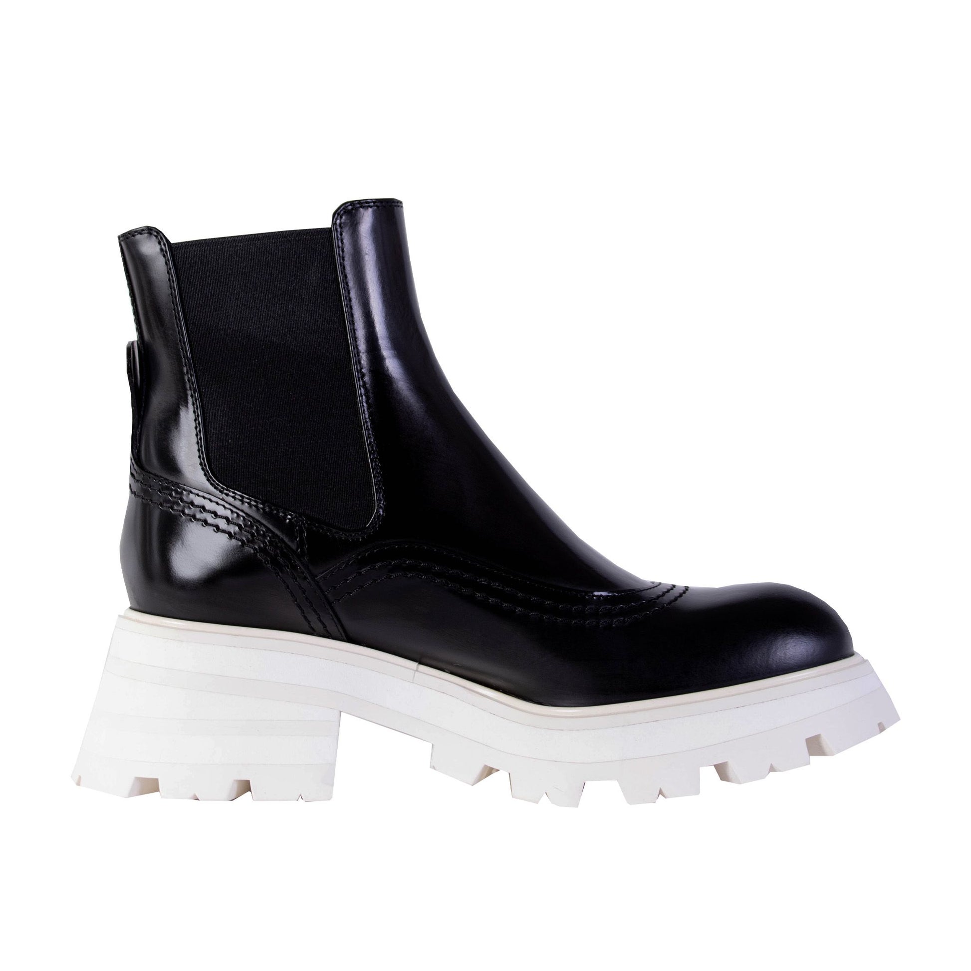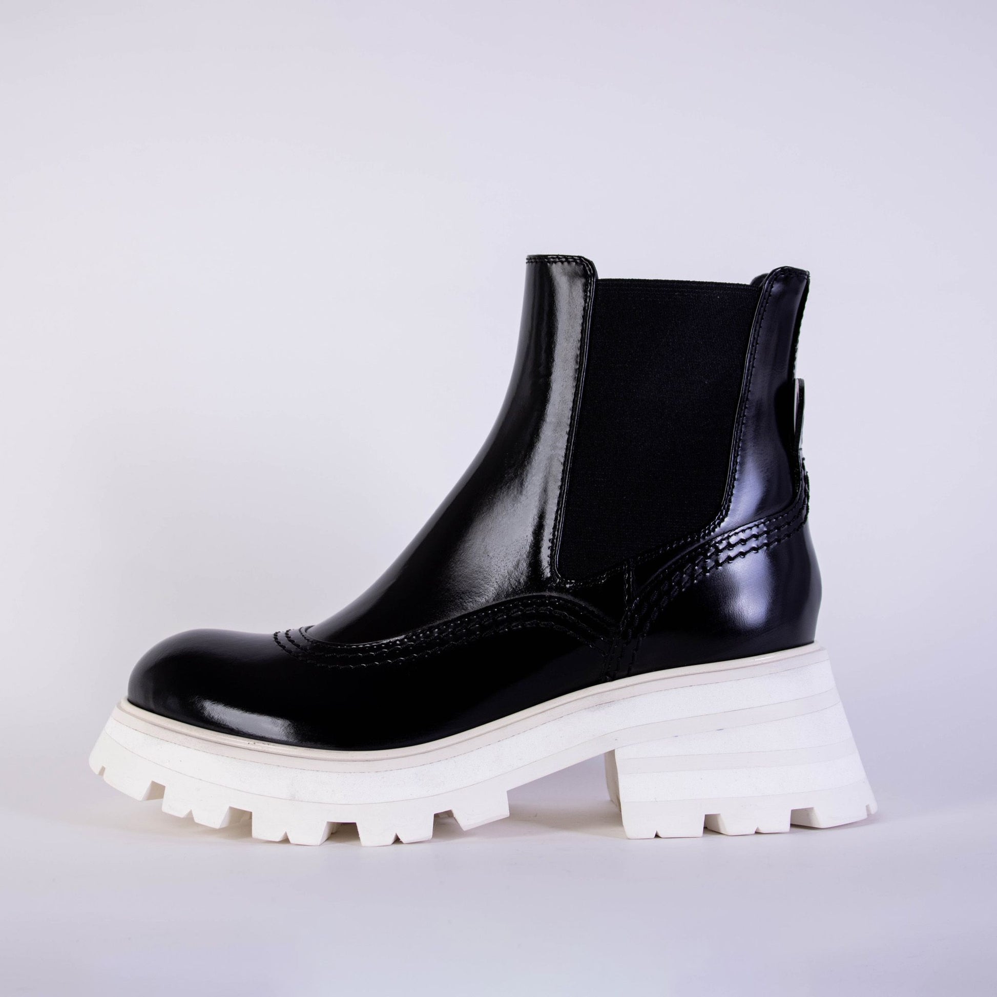 Model: Chelsea boots in brushed leather, black, tone on tone stitching, contrasting white oversized flared notched sole, layered heel. Back tongue with printed logo, tone-on-tone elasticated bands on the sides.