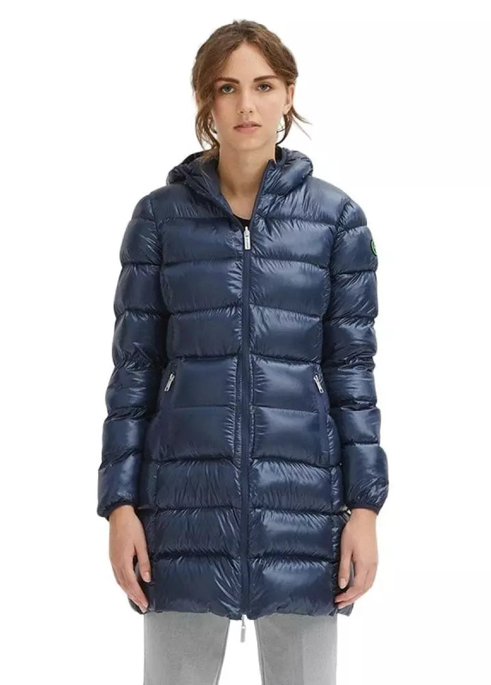 Centogrammi down jacket with hood, shiny blue on one side and opaque on the other, reversible design, padded with duck down.