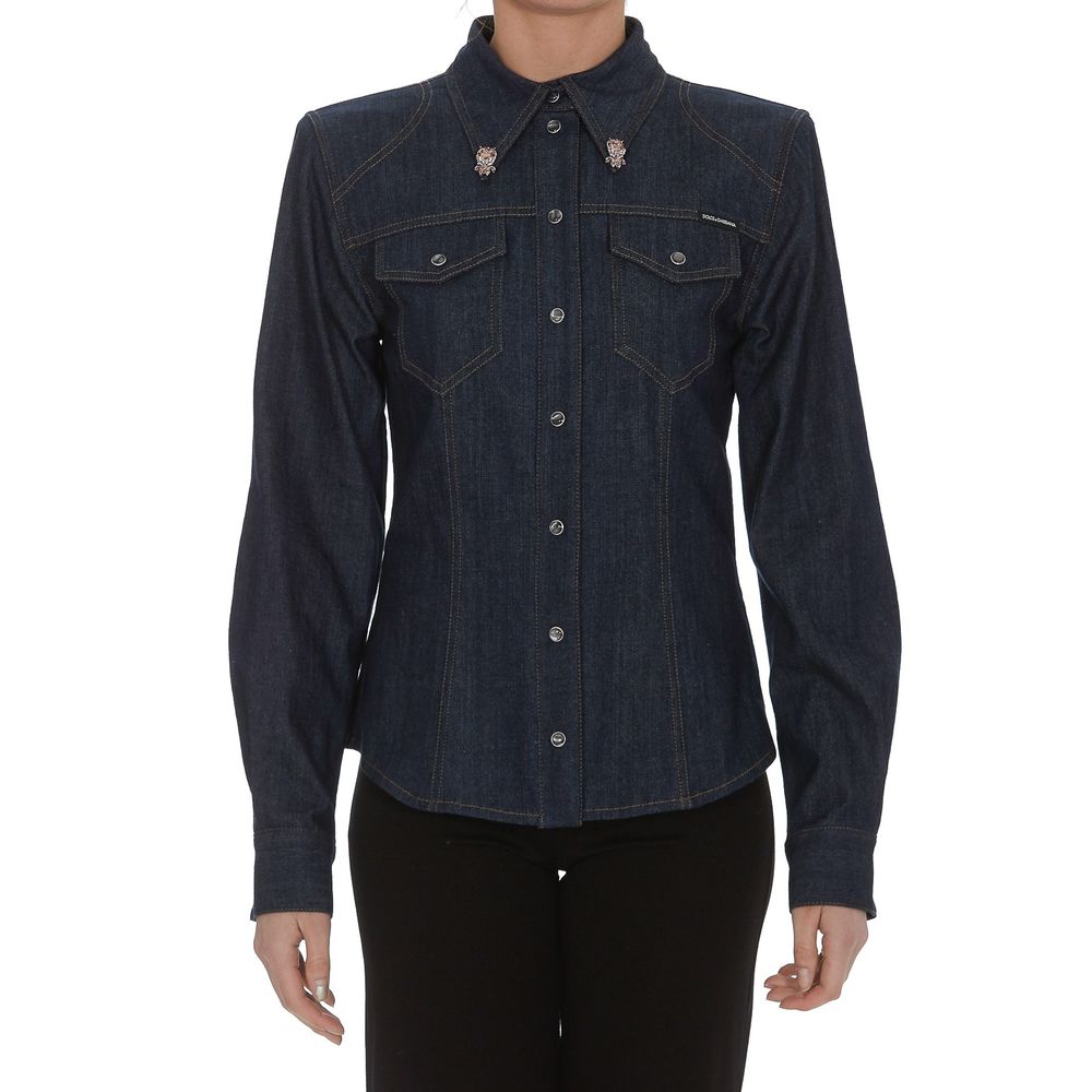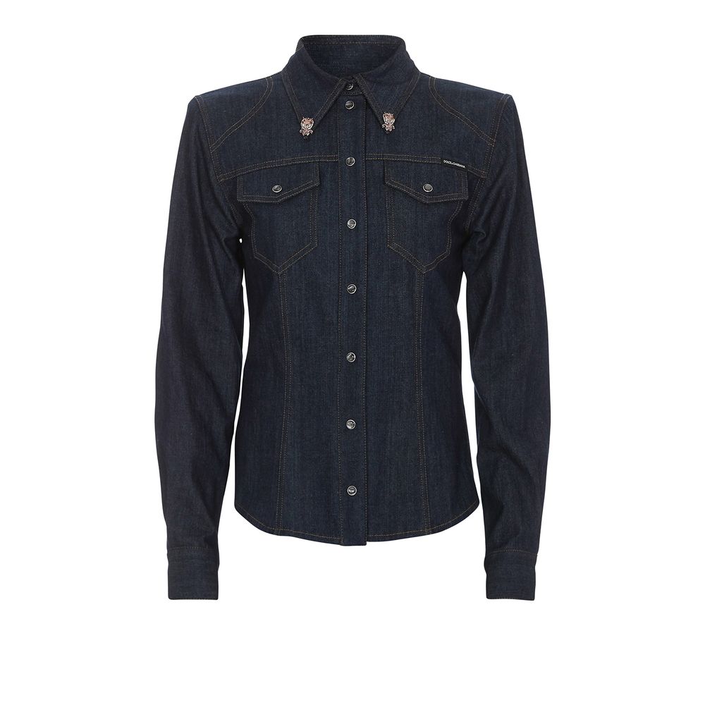 Dolce & Gabbana dark blue denim shirt, rhinestone detail on the collar. Made in Italy