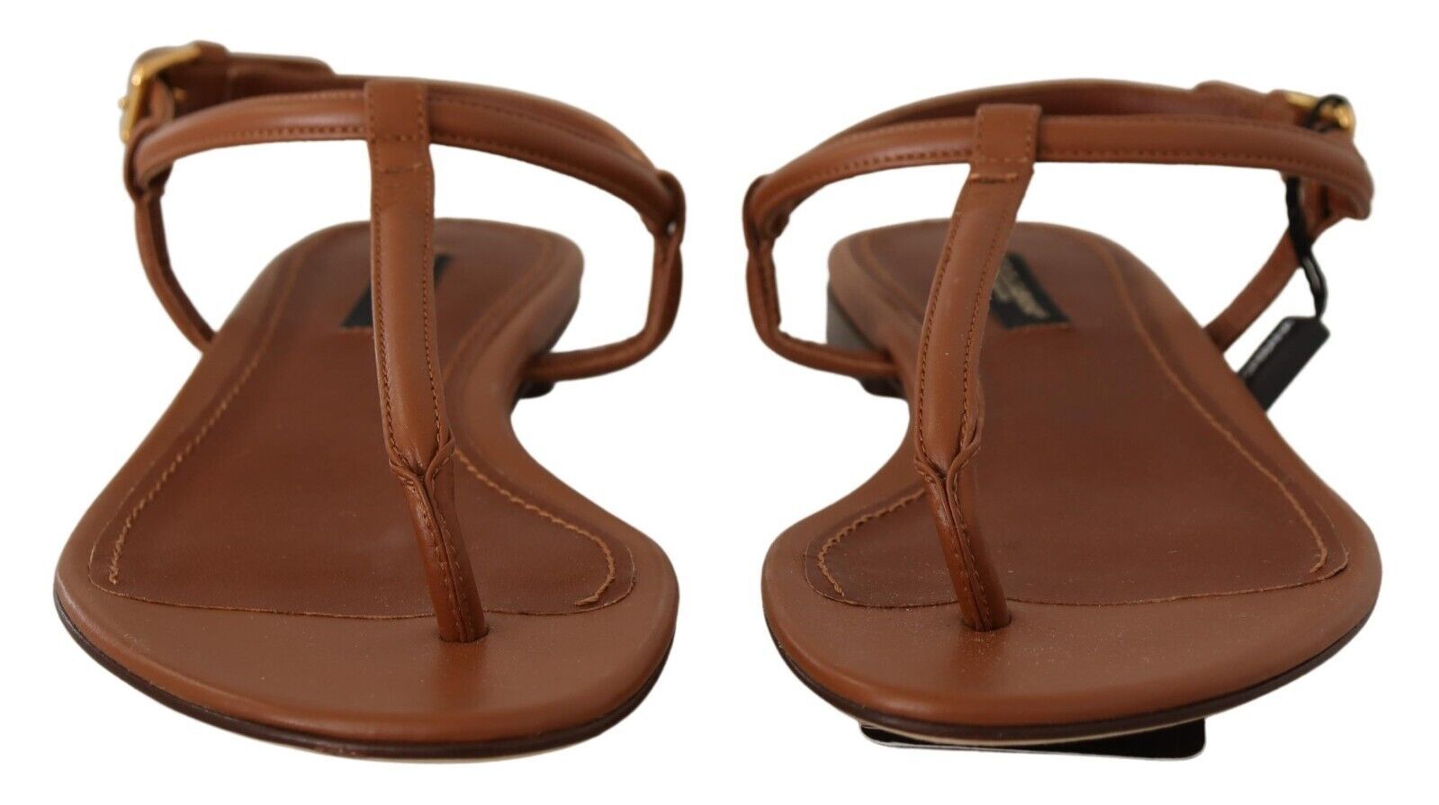 Dolce & Gabbana Brown Leather T-strap Slides Flats Sandals Shoes