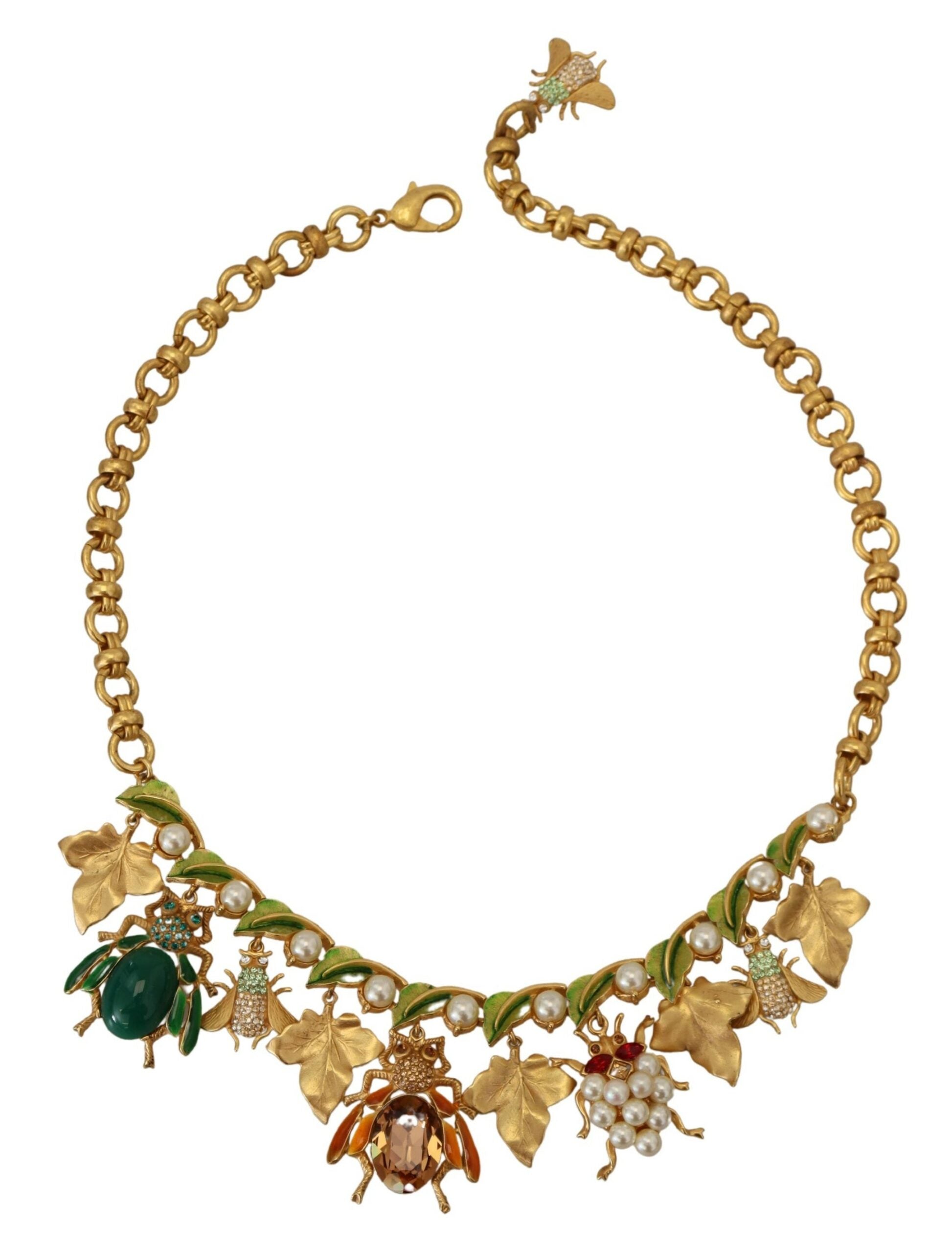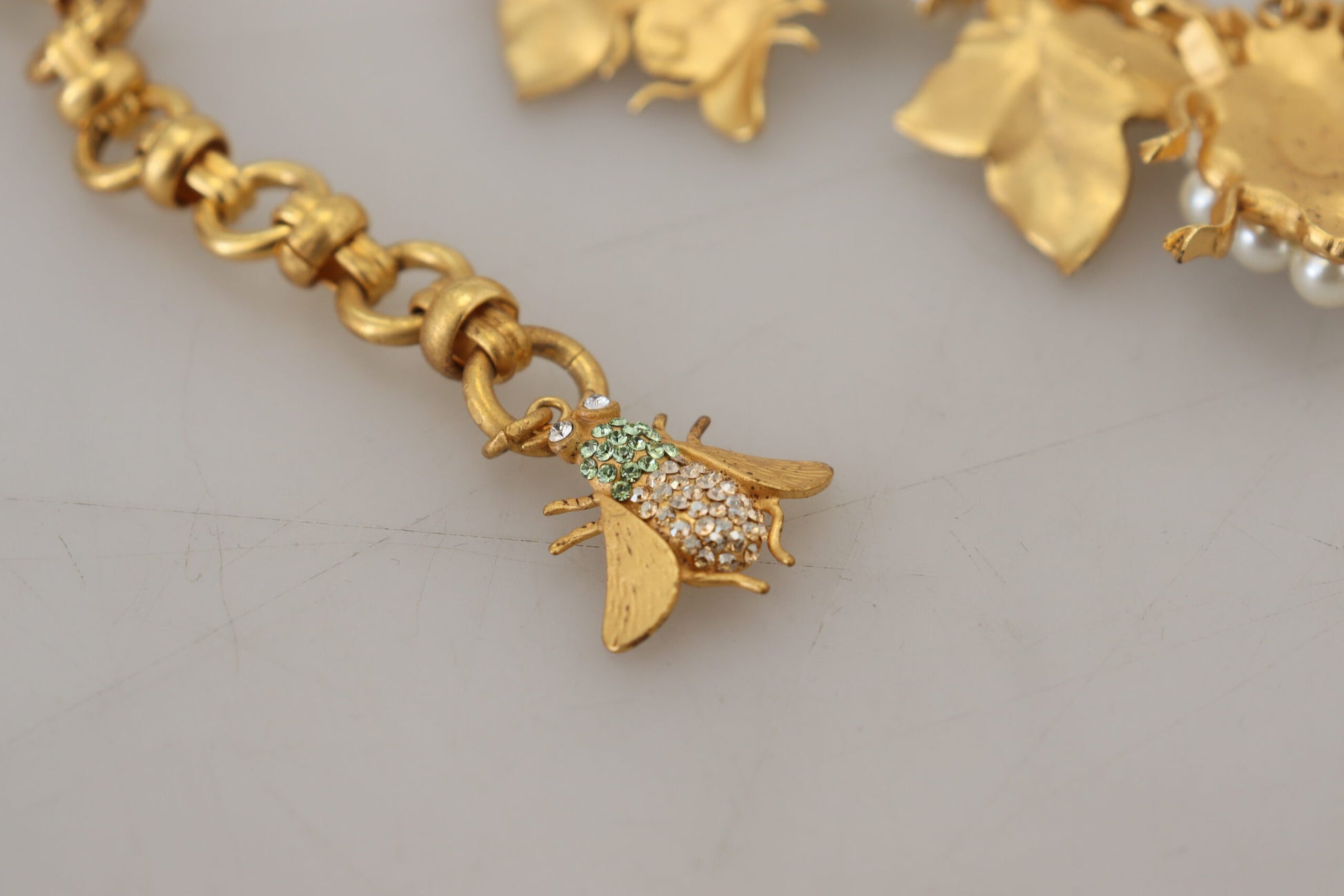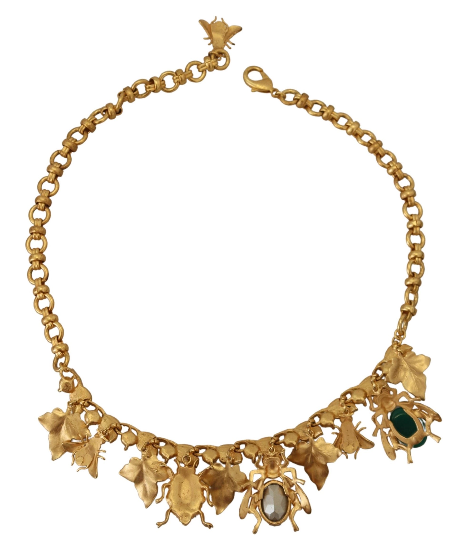 Dolce & Gabbana Gold Brass Crystal Logo Bug Floral Statement Necklace