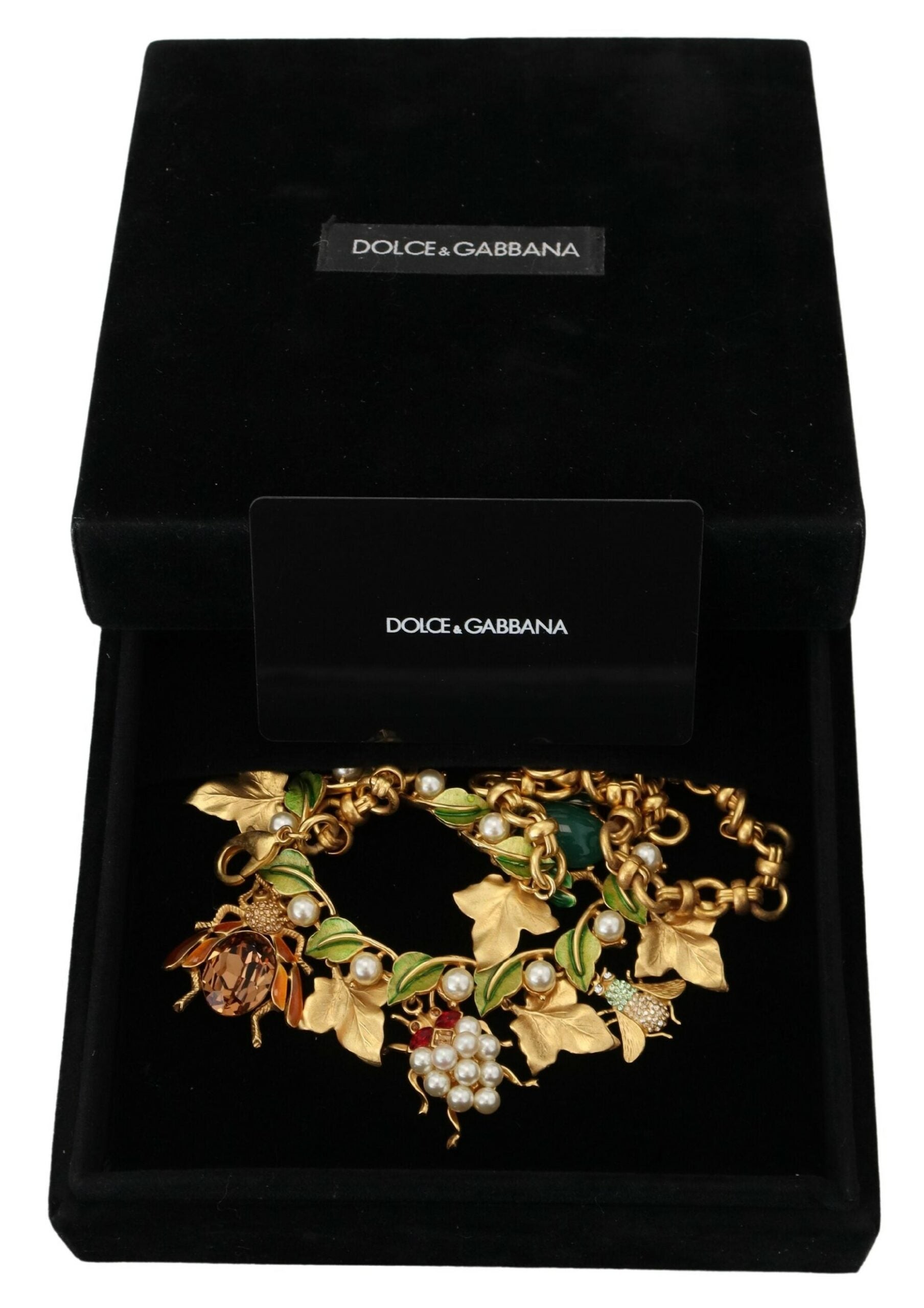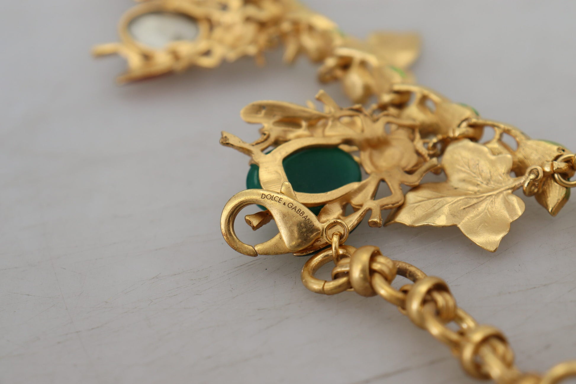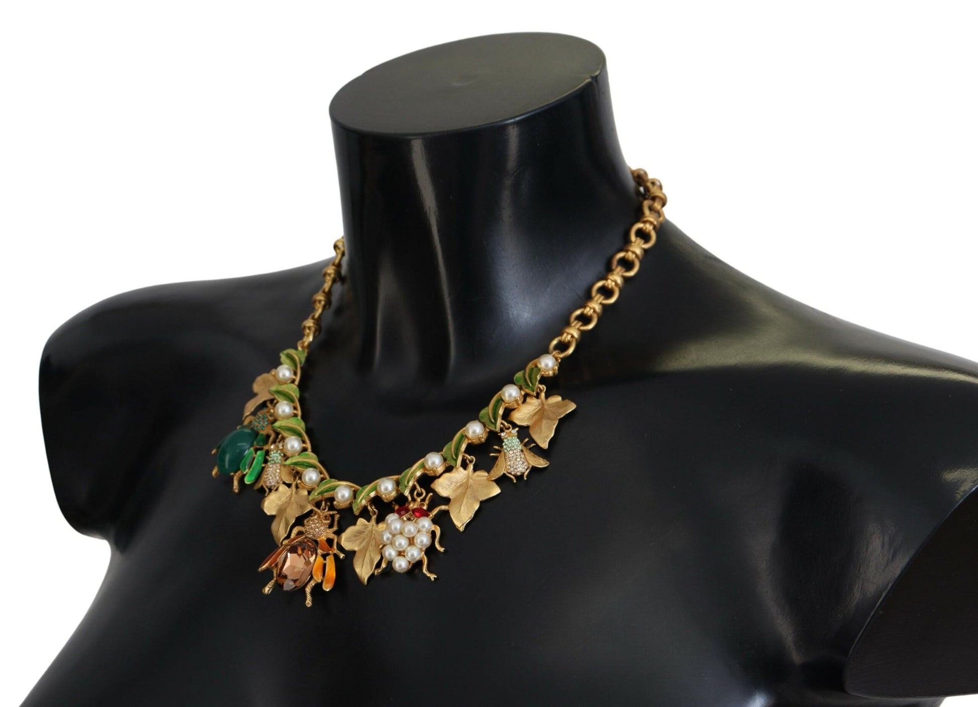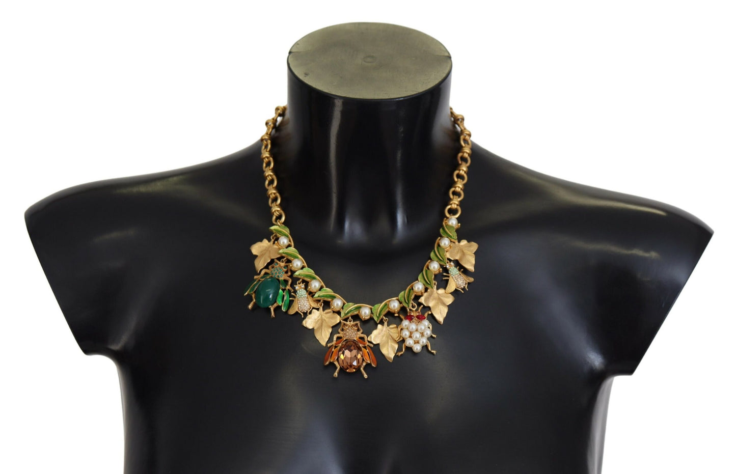 Dolce & Gabbana Gold Brass Crystal Logo Bug Floral Statement Necklace