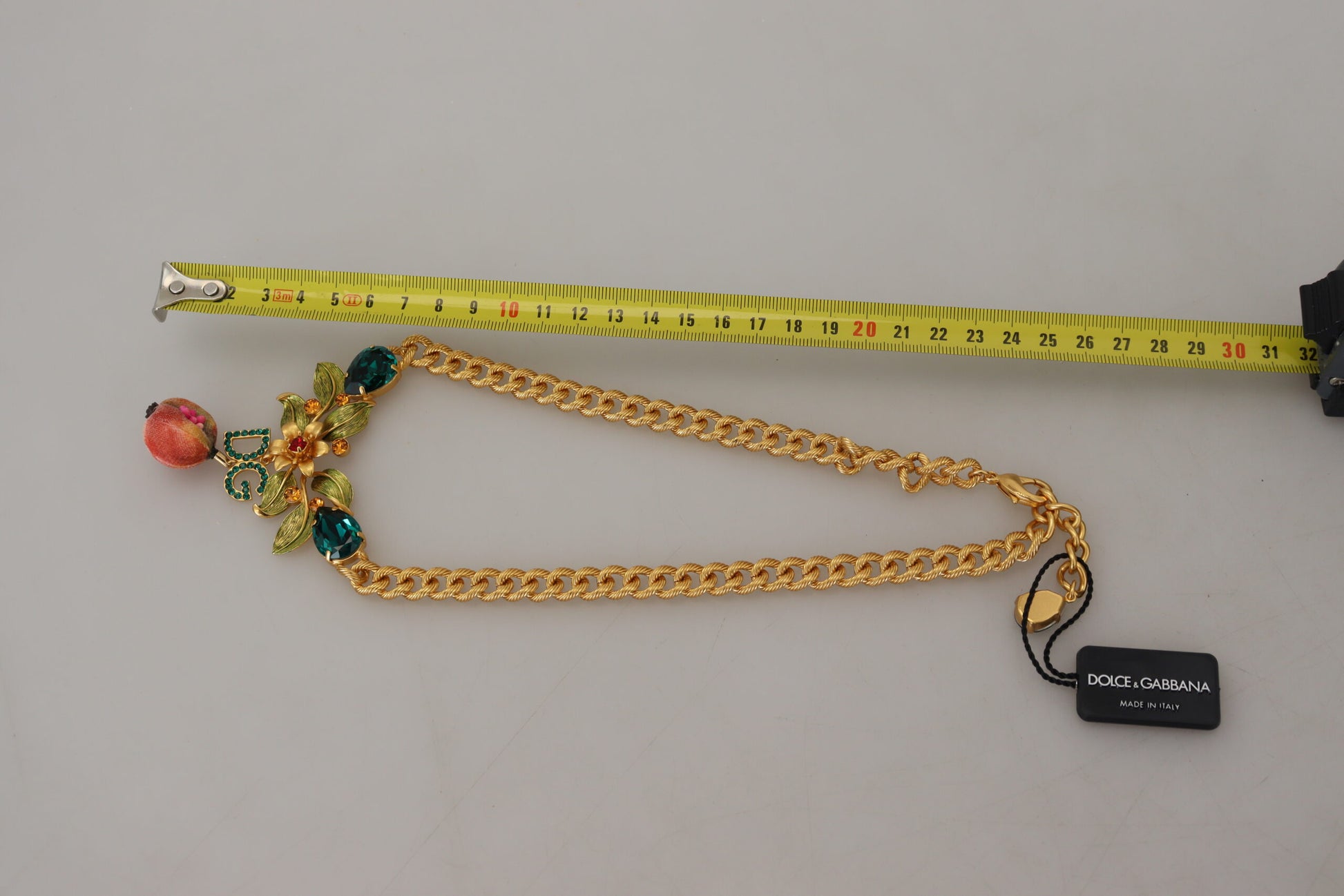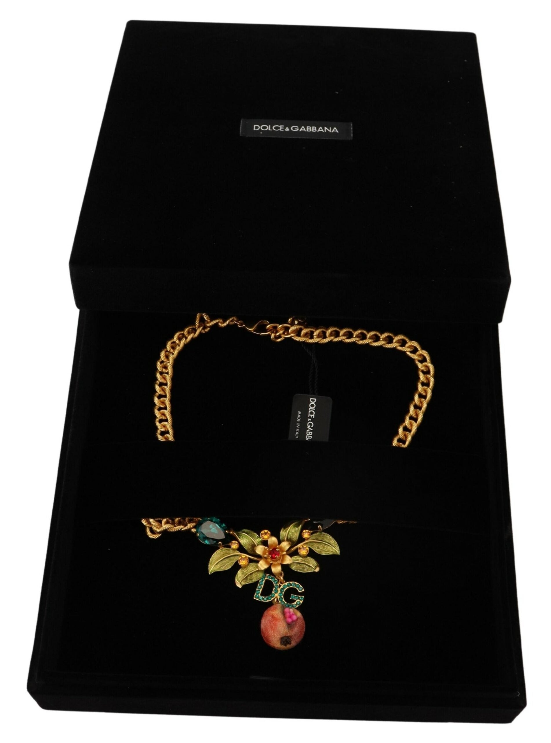 Dolce & Gabbana Gold Brass Crystal Logo Fruit Floral Statement Necklace