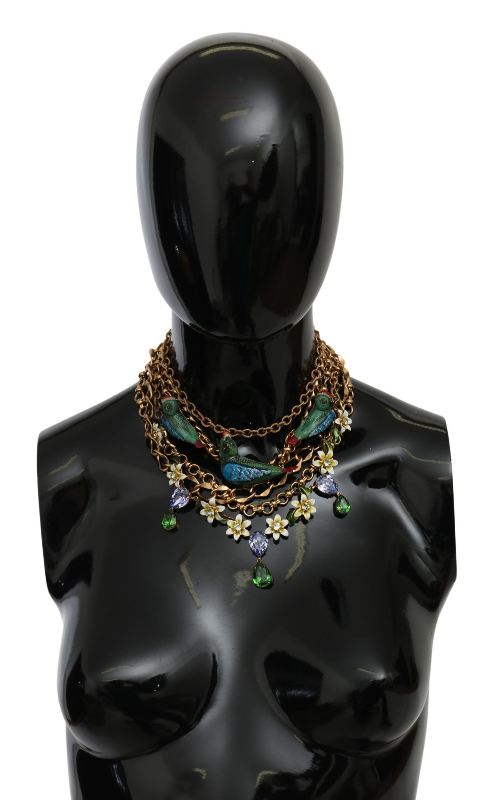 Dolce & Gabbana Gold Parrot Crystal Floral Charm Statement Necklace