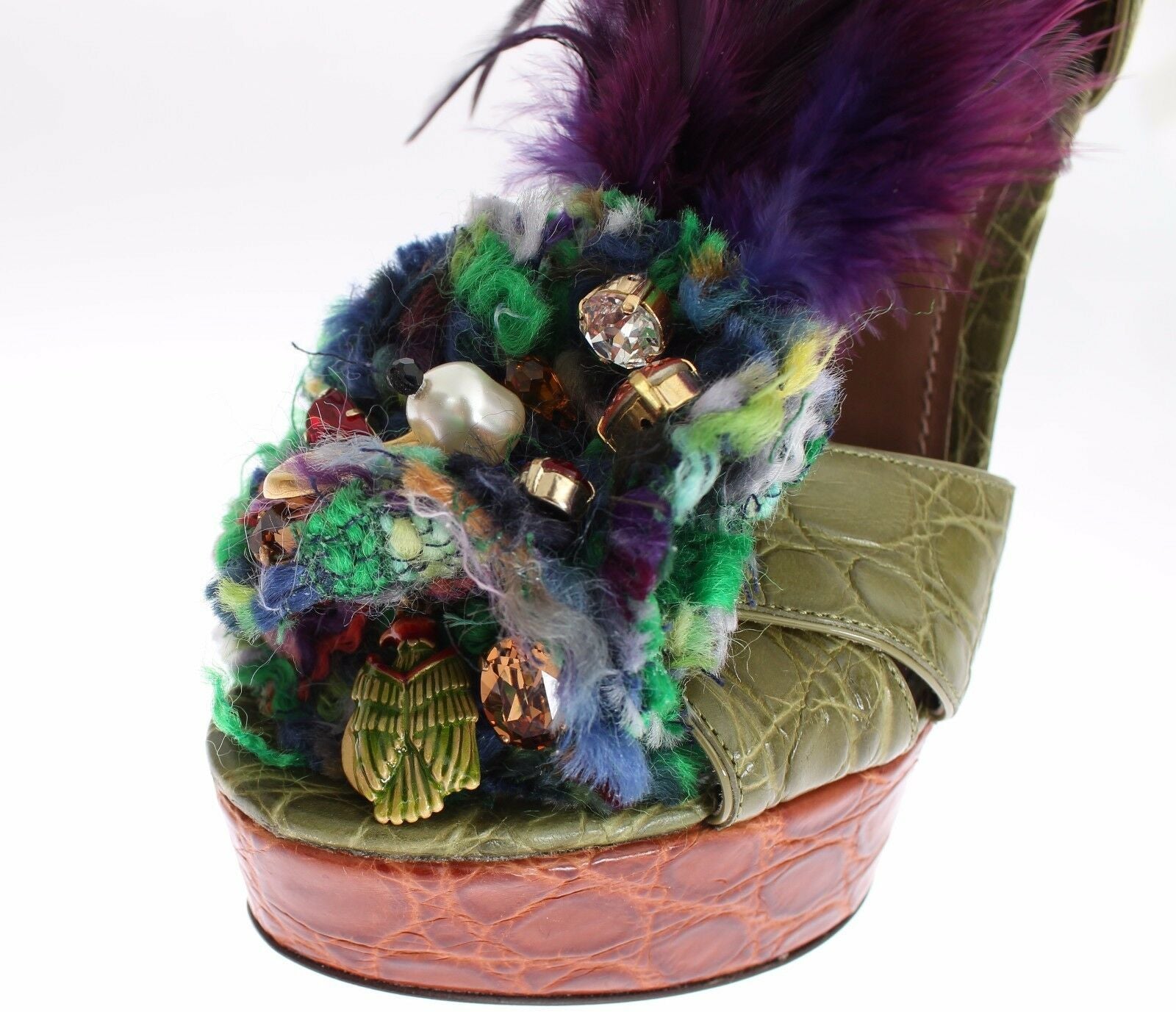 Dolce & Gabbana Green Leather Crystal Platform Sandal Shoes