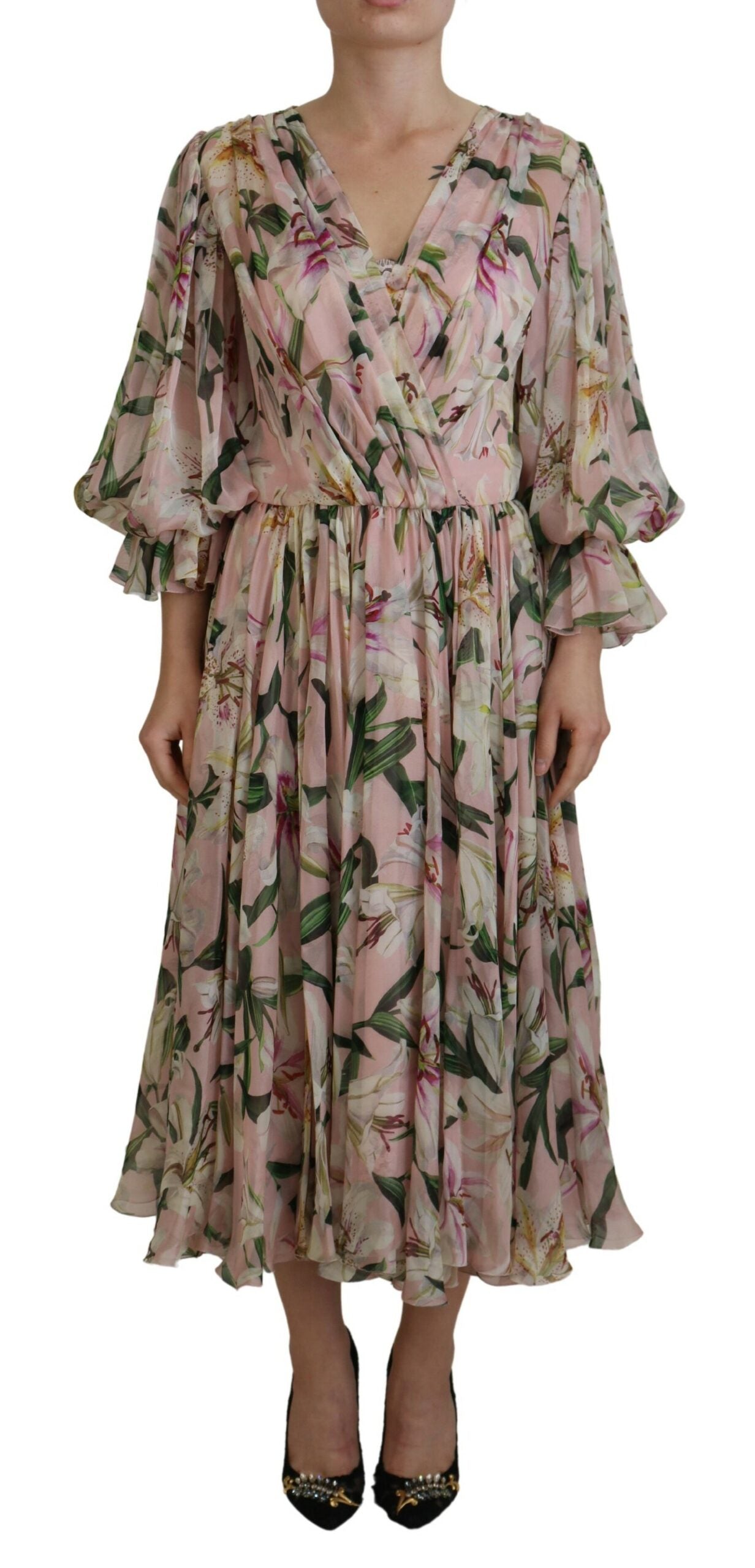 Dolce & Gabbana Pink Lily Print Silk A-line Pleated Maxi Dress