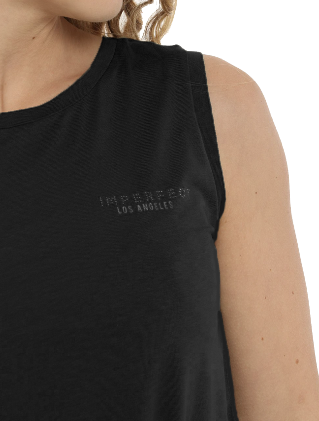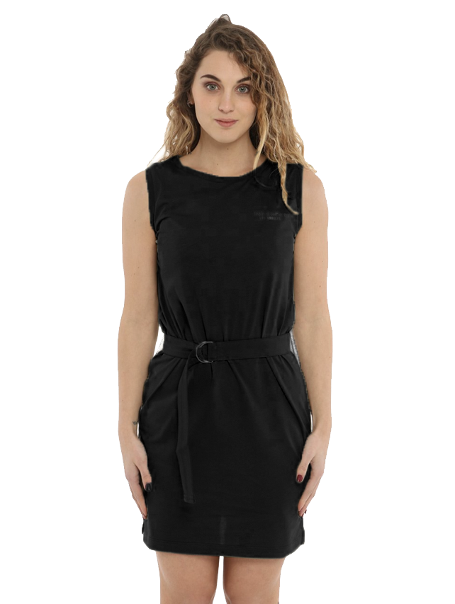 Imperfect short sleeveless dress with belt to tie at the waist, logo print on the chest