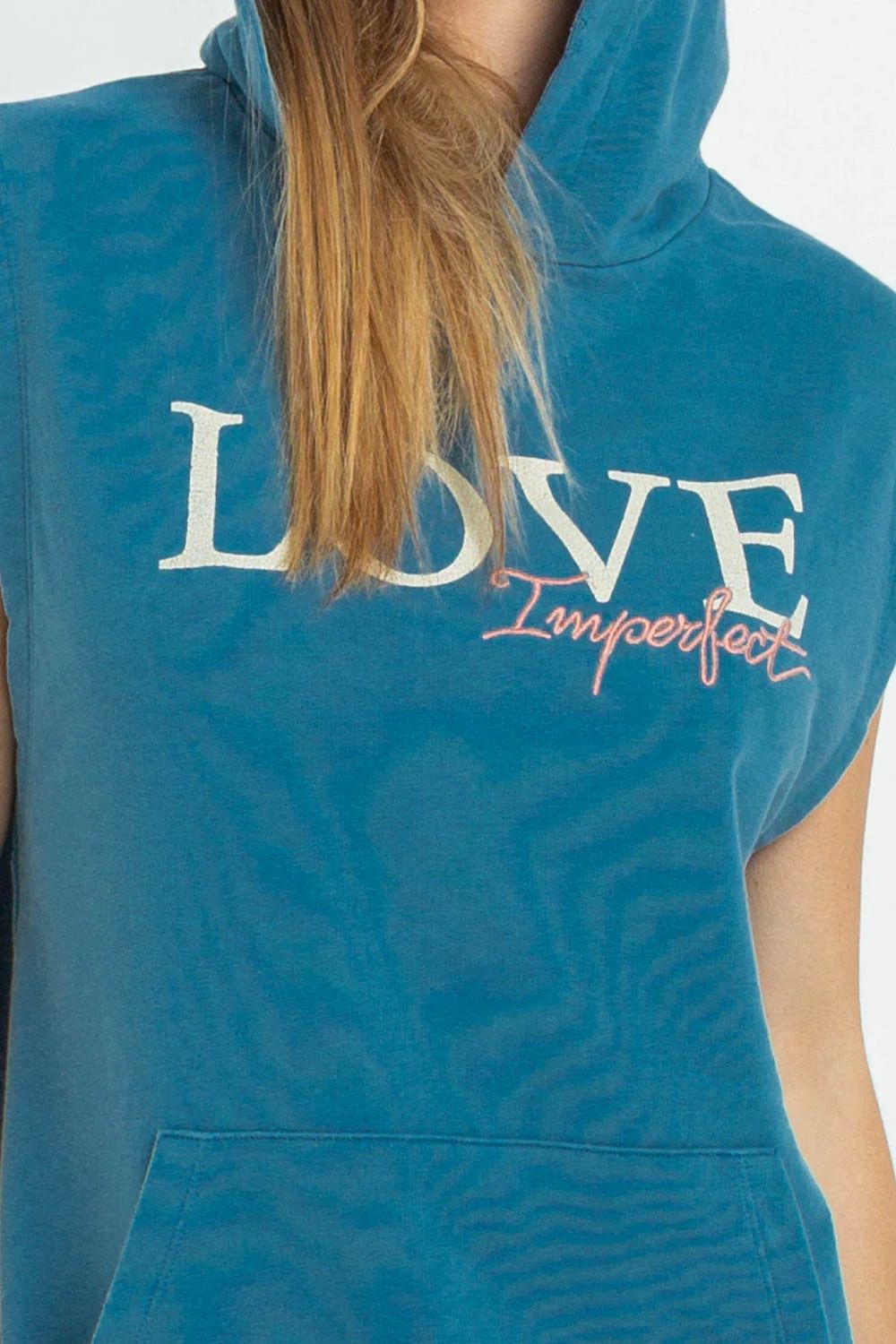 Maxi camisole dress with front kangaroo pocket, wide armholes, hood, front logo embroidery and elastic knit hem. Comfortable fit