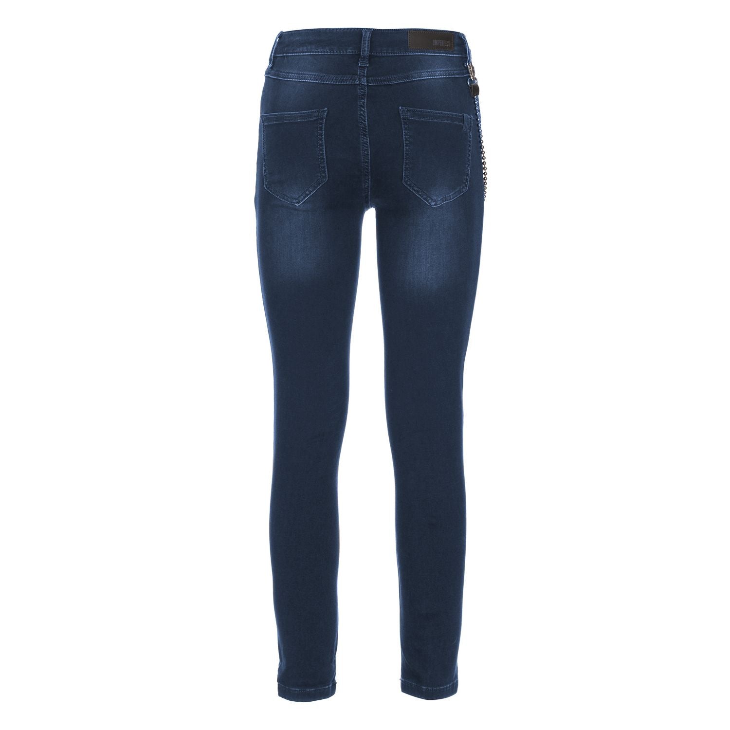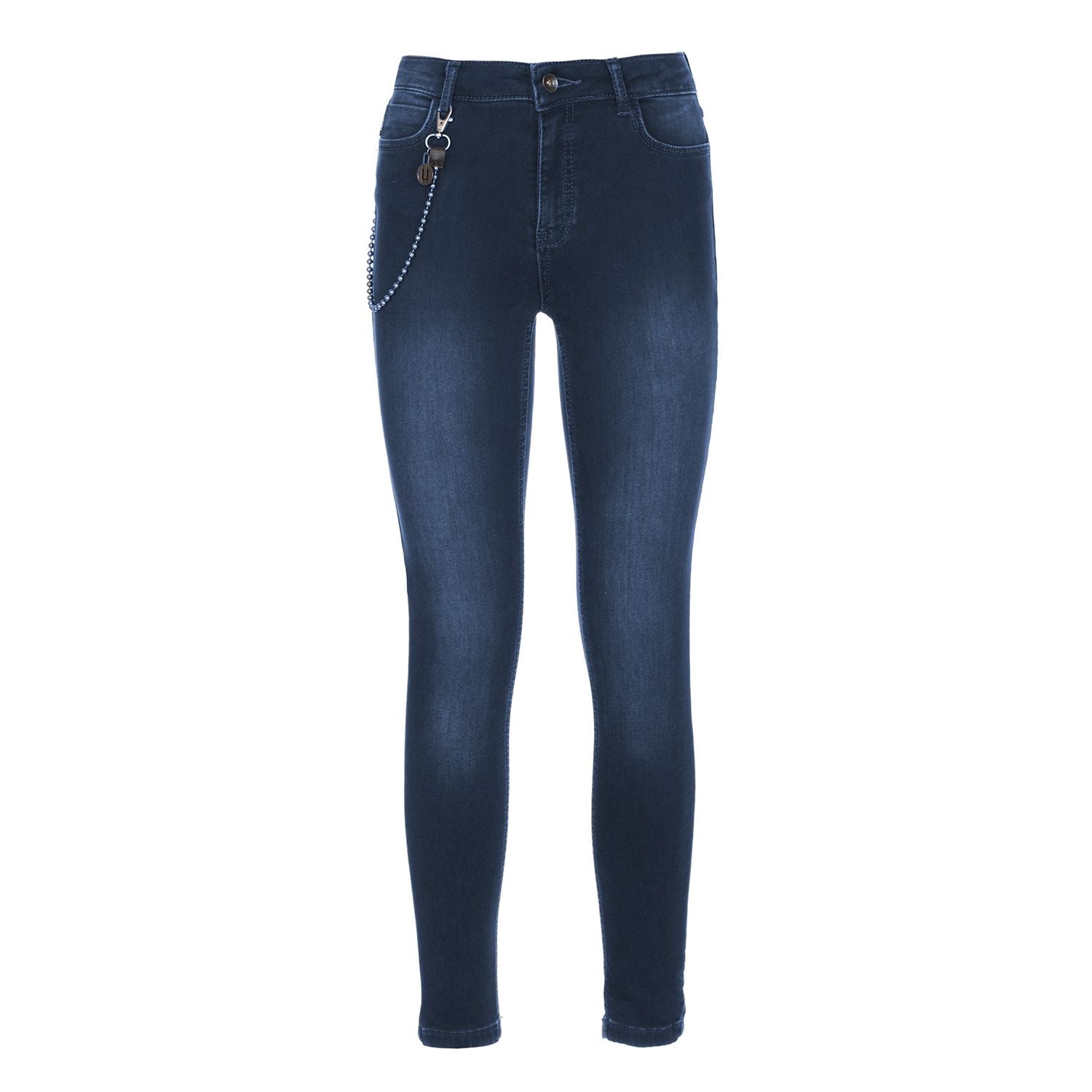 Imperfect lightly washed blue plush jeans, decorative chain hanging from the loops, slim fit.
