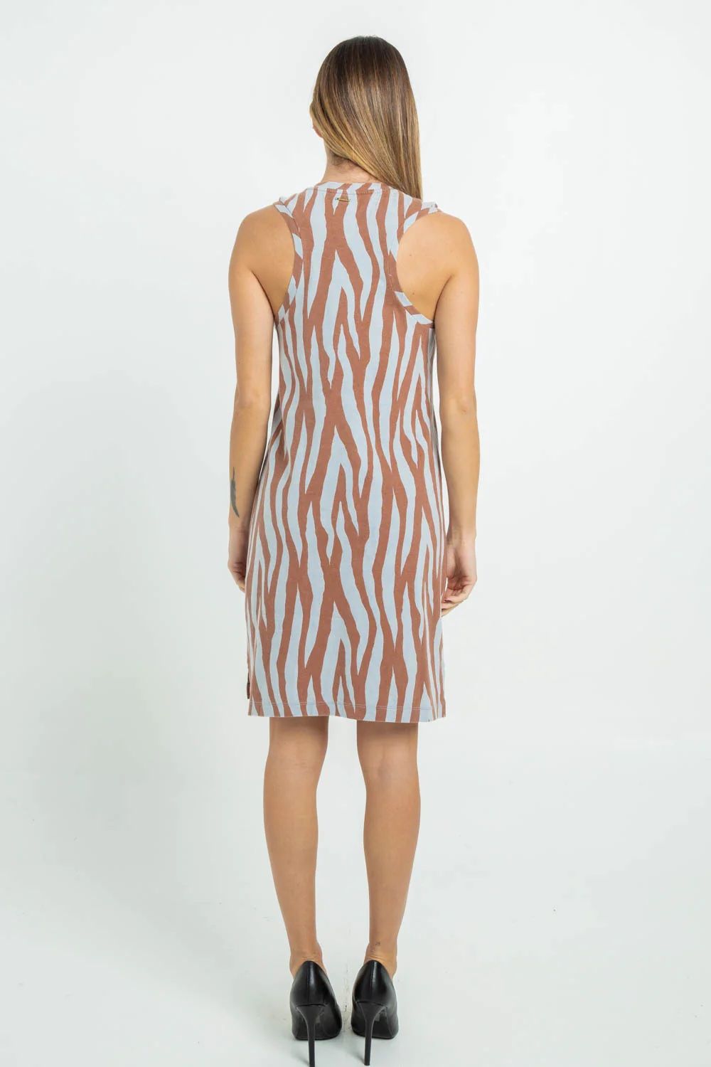 Patterned camisole dress with round neckline and plunging back neckline. Regular fit