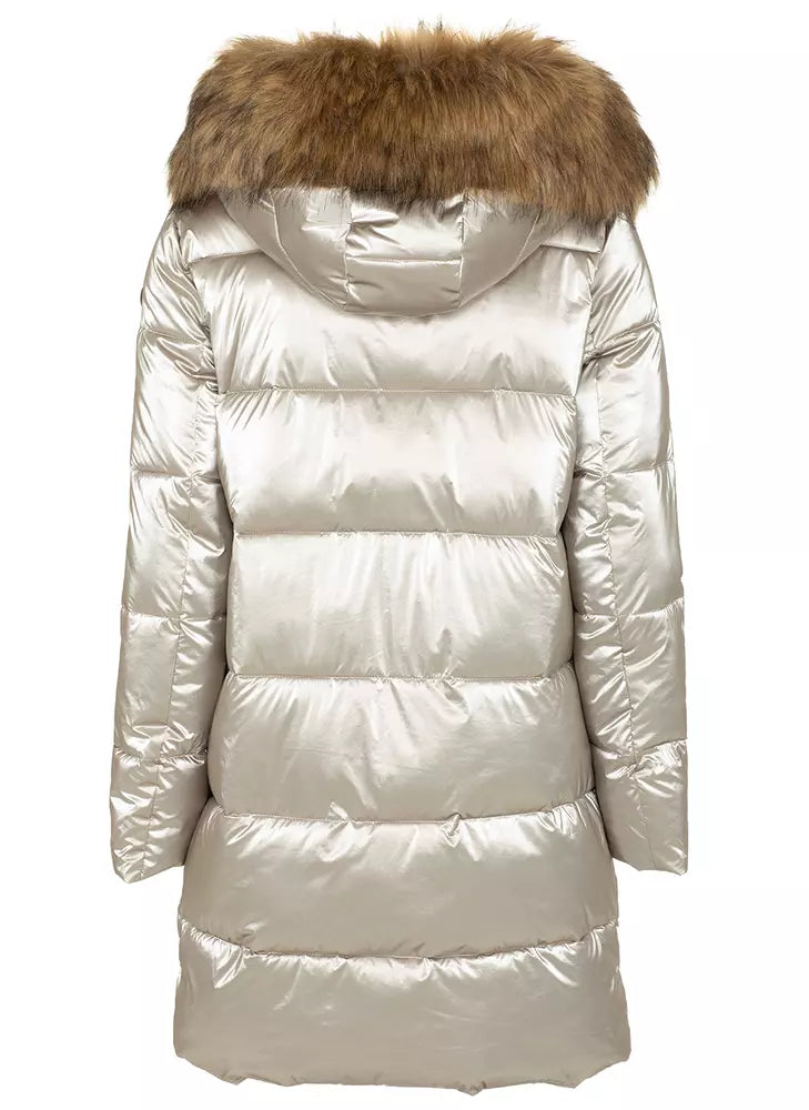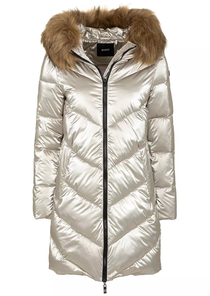 Imperfect long down jacket in polyamide with hood and eco-fur, two side pockets, zip closure