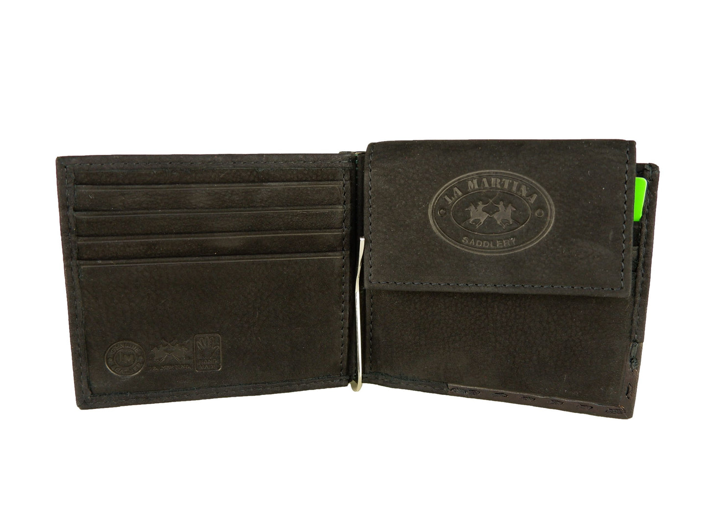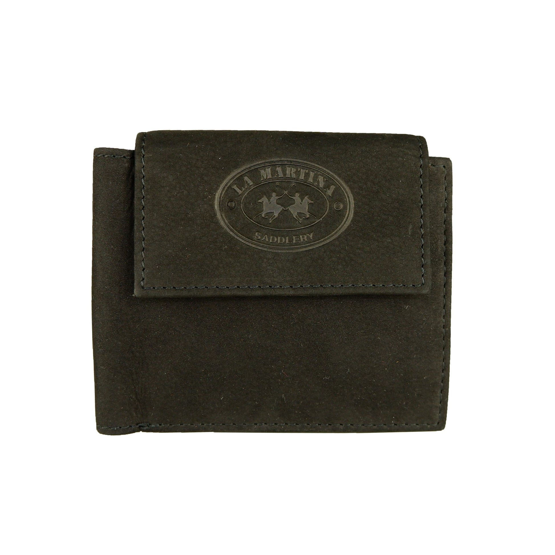 La Martina wallet, black color, brand logo on the front, coin and money clips inside. Size cms: 11×10. Made in Italy