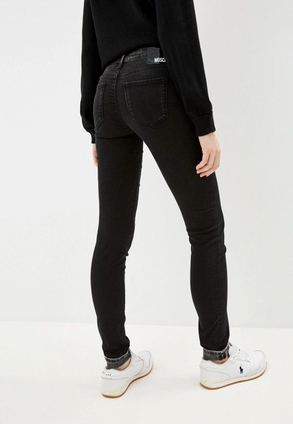 Love Moschino black overdyed stretch jeans, with uniform coloring. Particularly soft fabric, with estastomultiester. Slightly discolored at the waist. Slim line, slim on the leg, medium-high waist. Bottom with lighter contrast turn-up. Zip and button closure. Five-pocket model. Black patent leather label, with white contrasting logo.