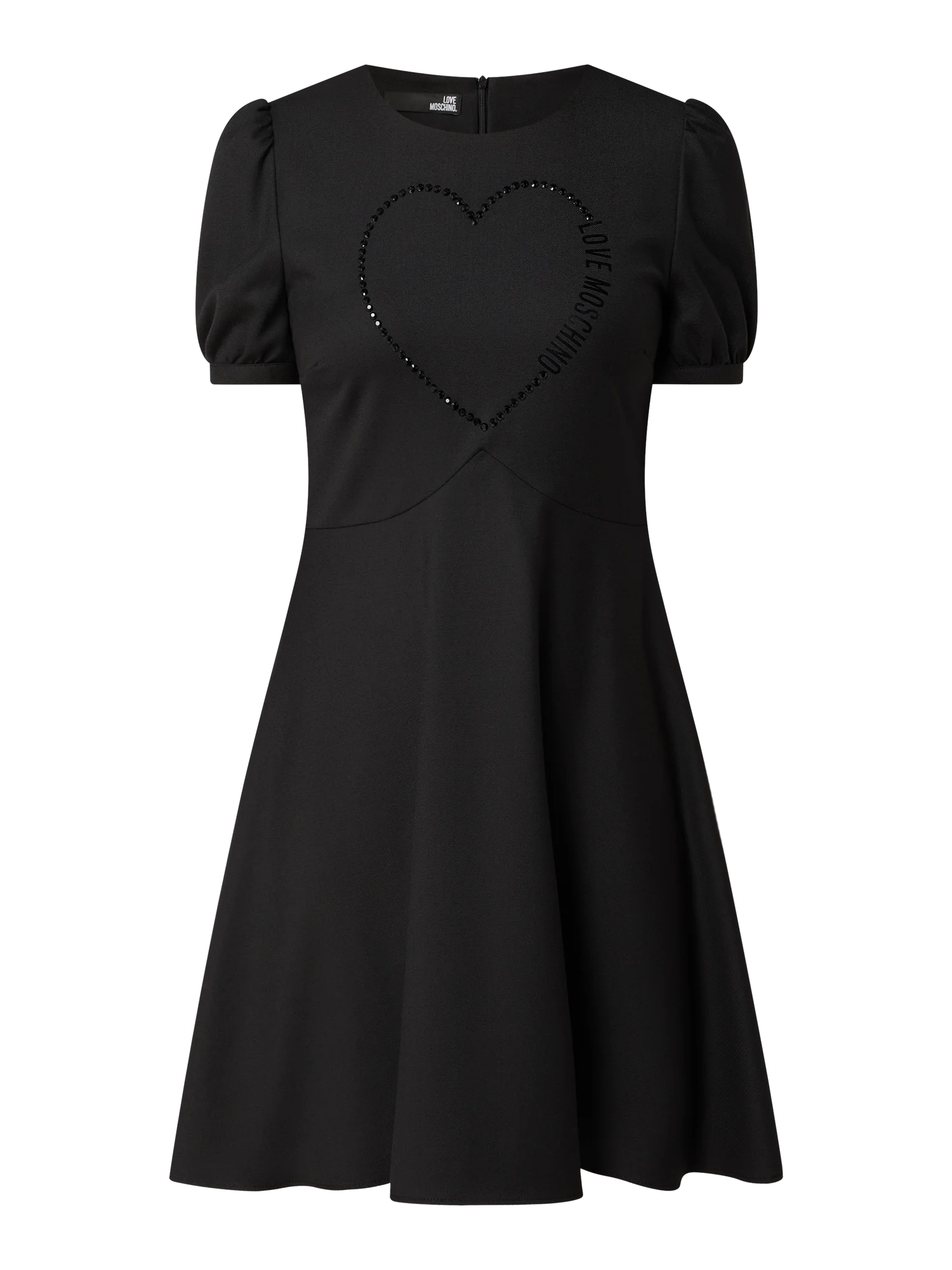 Love Moschino women’s dress with short sleeves with rhinestone application on the front, zip closure on the back.