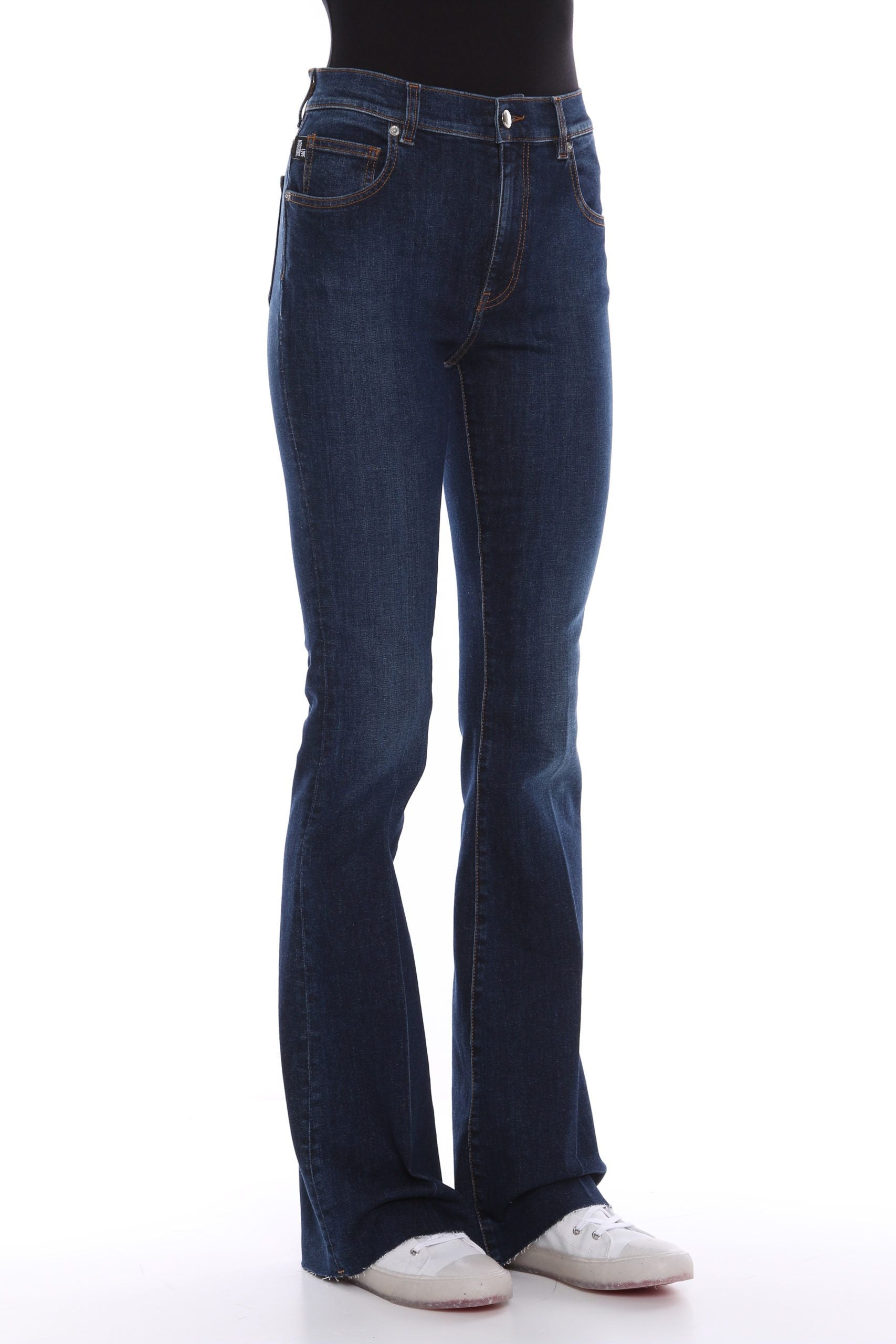 Love Moschino women’s dark blue bell-bottomed jeans, leather patch with metal logo on the back