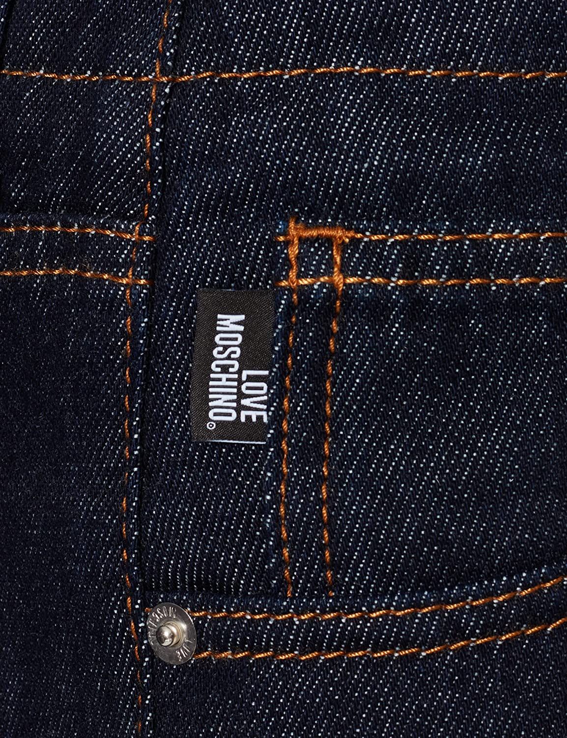 Love Moschino wide five-pocket jeans in 100% cotton denim, with back in fleece cotton, Love Moschino leather patch on the back. Rolled cuffs with black jacquard logo.