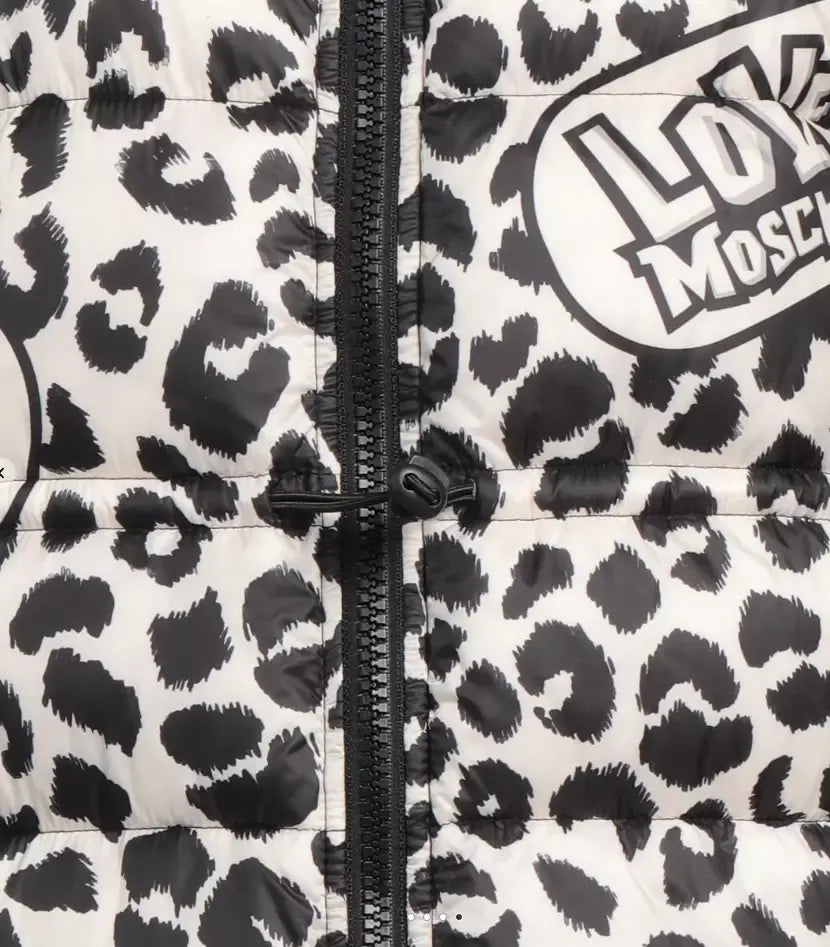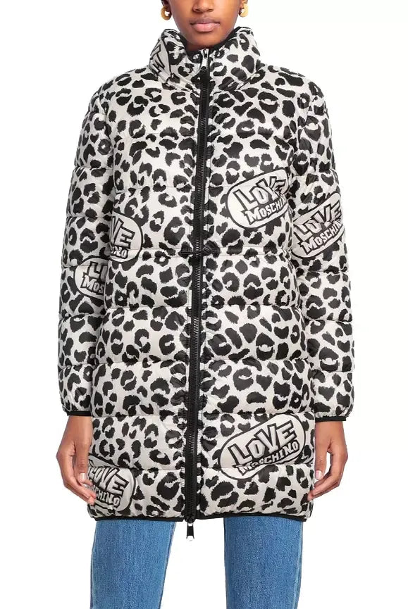 Love Moschino long polyester down jacket with leopard-themed print and logos all over the surface