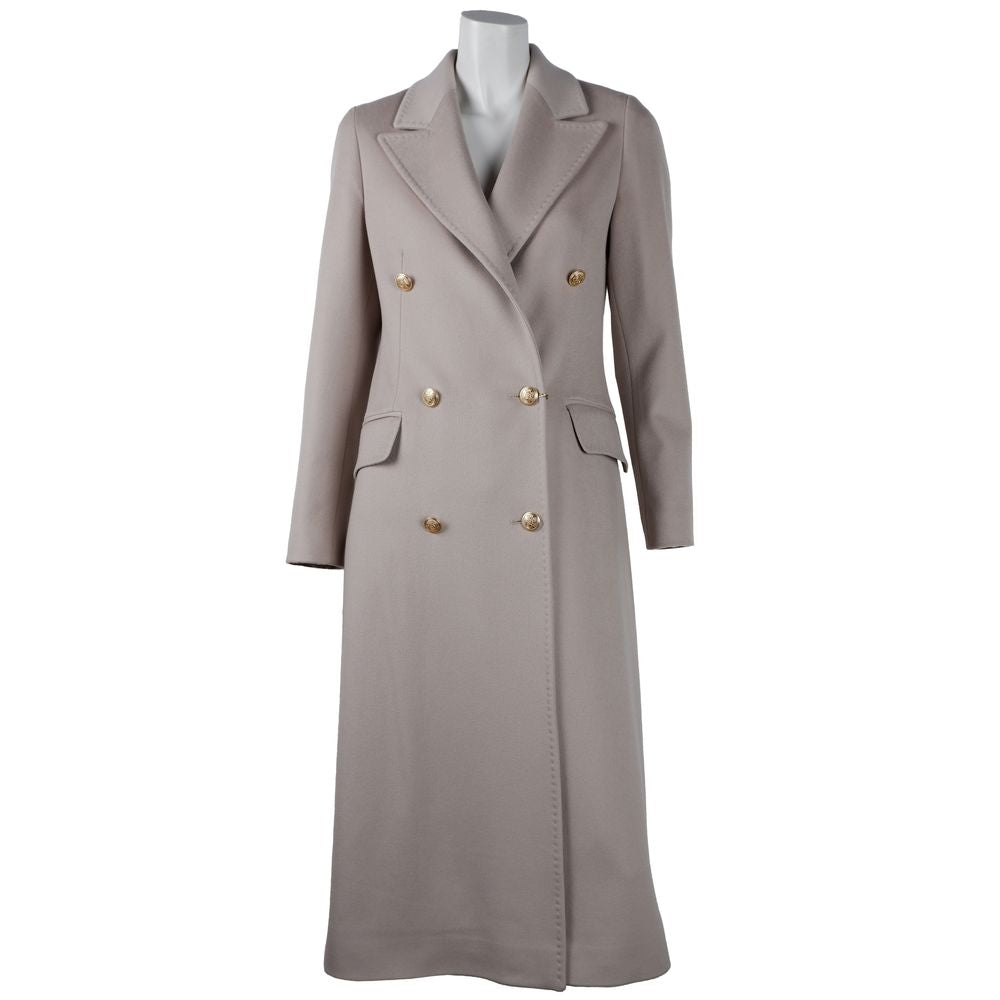 Loro Piana Woven combed virgin wool double-breasted long coat that is embellished with gold hardware buttons. Made in Italy