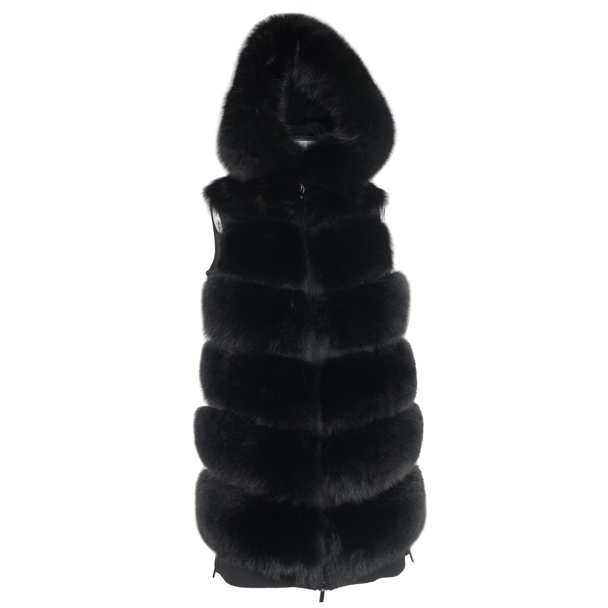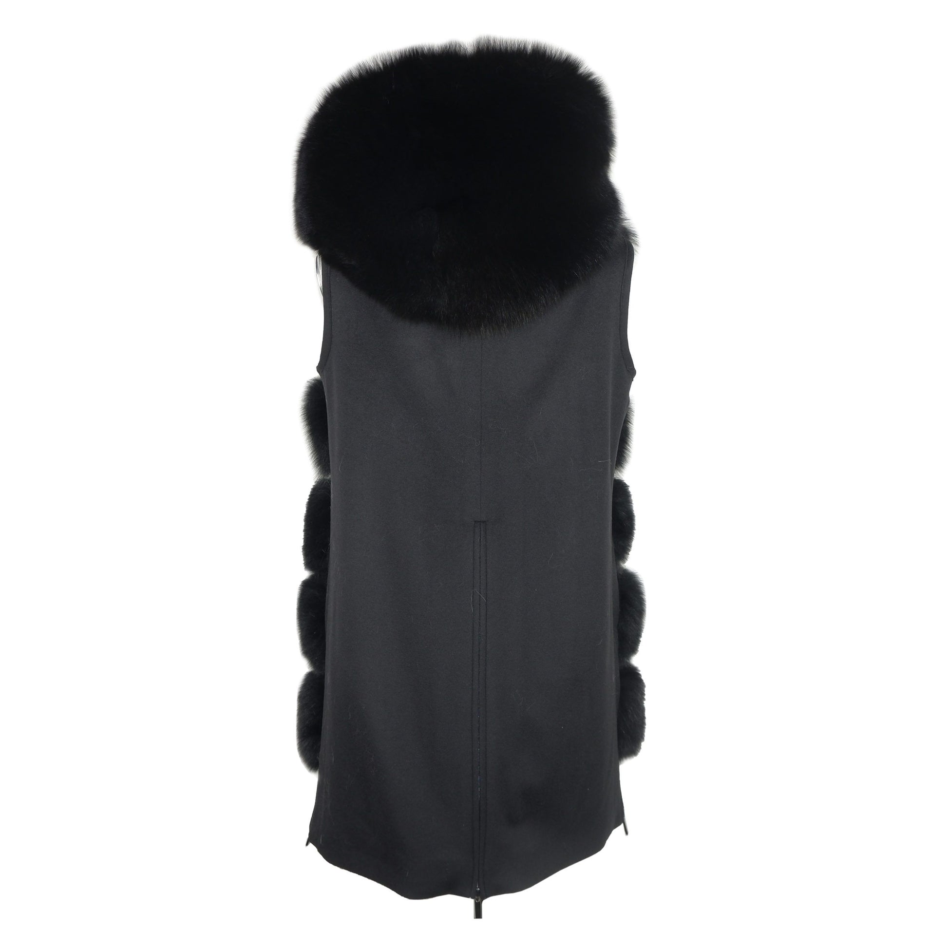 Loro Piana Wool sleeveless coat fabric lined with fox fur on the front, zip closure and side zip opening, hood with fur. Made in Italy
