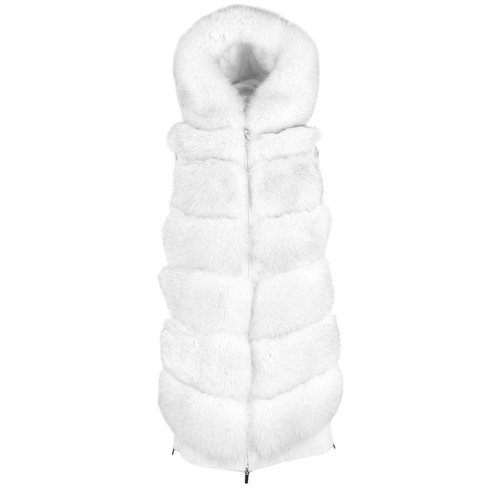 Loro Piana Tessuto 2023 sleeveless wool coat lined with fox fur on the front, zip closure and side opening zips, hood with fur.