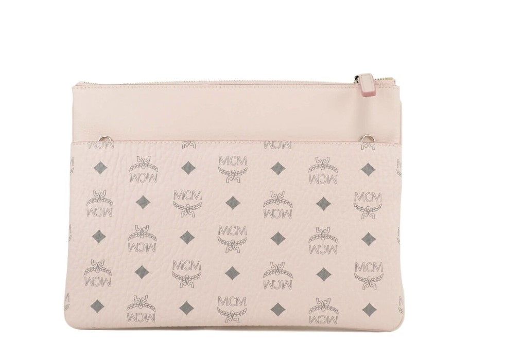 MCM Portuna Medium Visetos Powder Pink Coated Canvas Flat Pouch Crossbody Bag