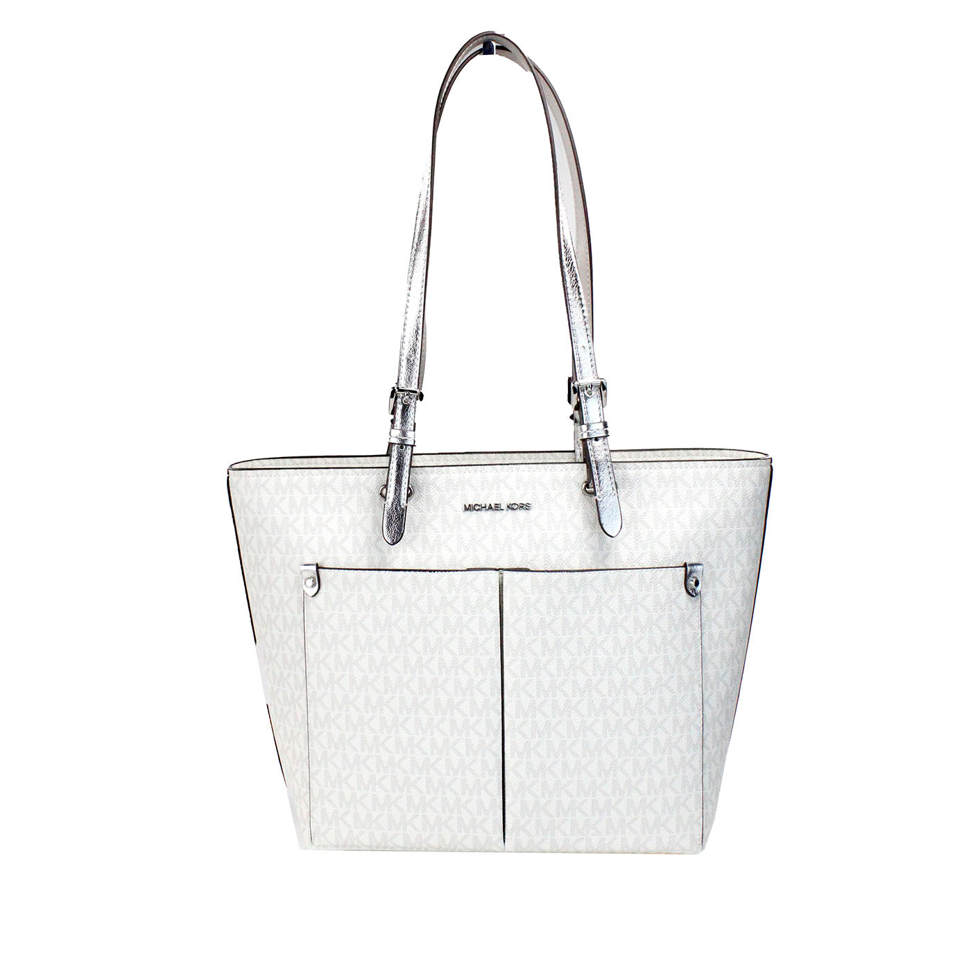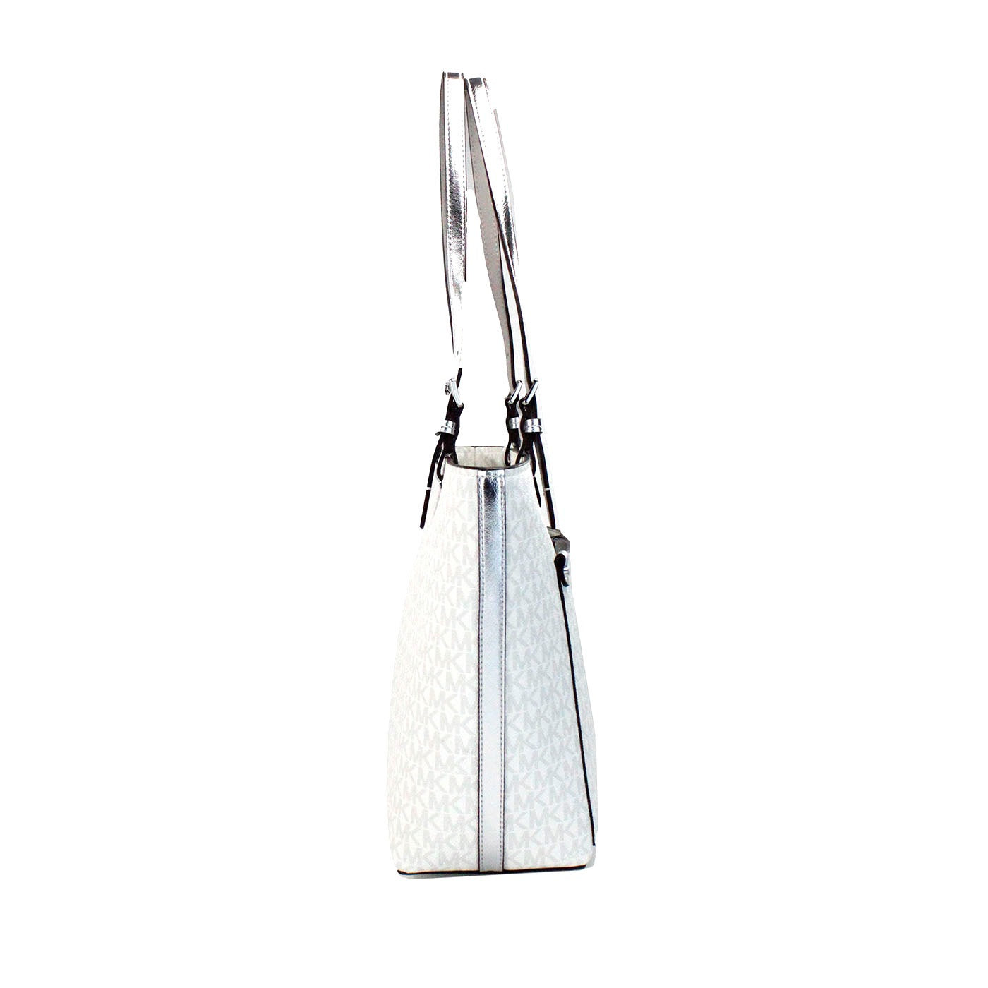 Style: Michael Kors Jet Set Medium Optic White Silver Double Pocket Tote Handbag