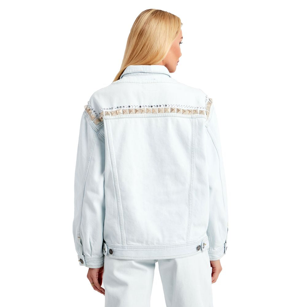 Pinko light blue denim jacket with metal studs and applied glitter and crystal details, two chest pockets and two front pockets, button closure