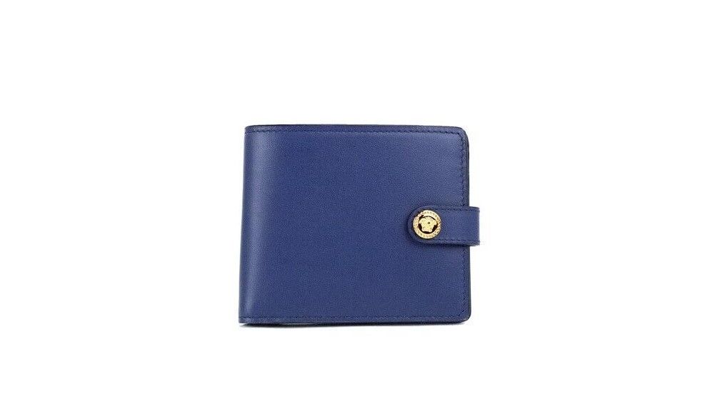 Versace Navy Blue Compact Smooth Leather Gold Toned Medusa Snap Bifold Wallet