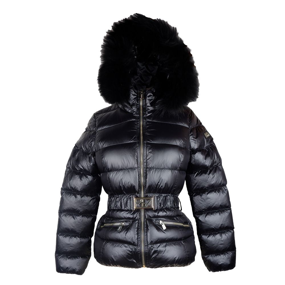 Yes Zee jacket, black color, brand logo on the side, front zip closure, belt with brand metal logo, real murmasky fur.